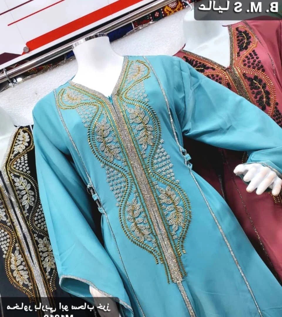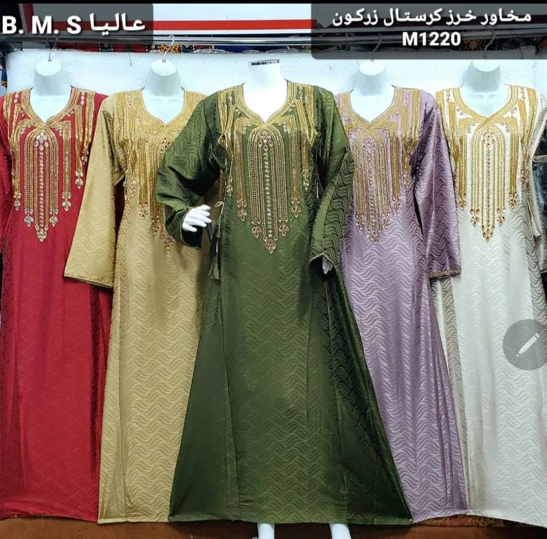 جلابيات ومخاور نسائية بتصميم فاخر من قماش ناعم عالي الجودة مزينة بتطريز ذهبي جذاب يضفي لمسة من الفخامة والرقي. تتميز بقصّة فضفاضة مريحة تناسب جميع المناسبات، مع تفاصيل أنثوية تضفي مظهرًا راقيًا وأنيقًا.