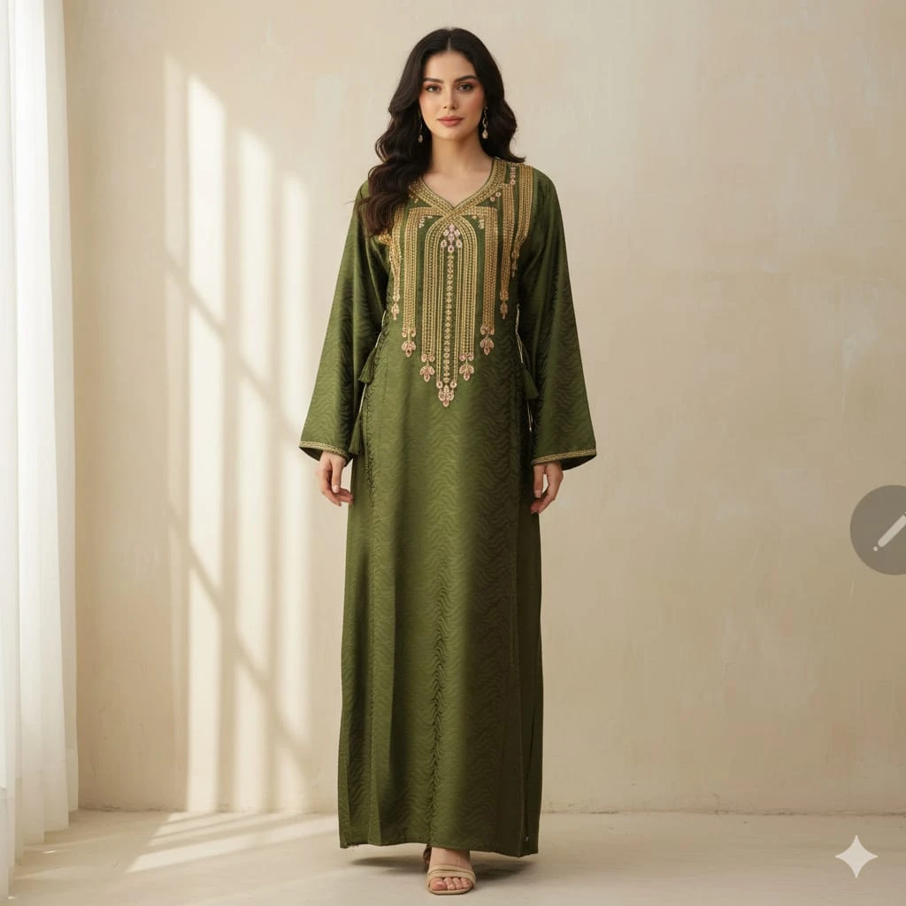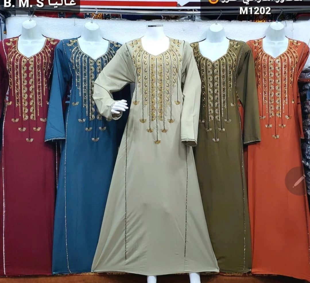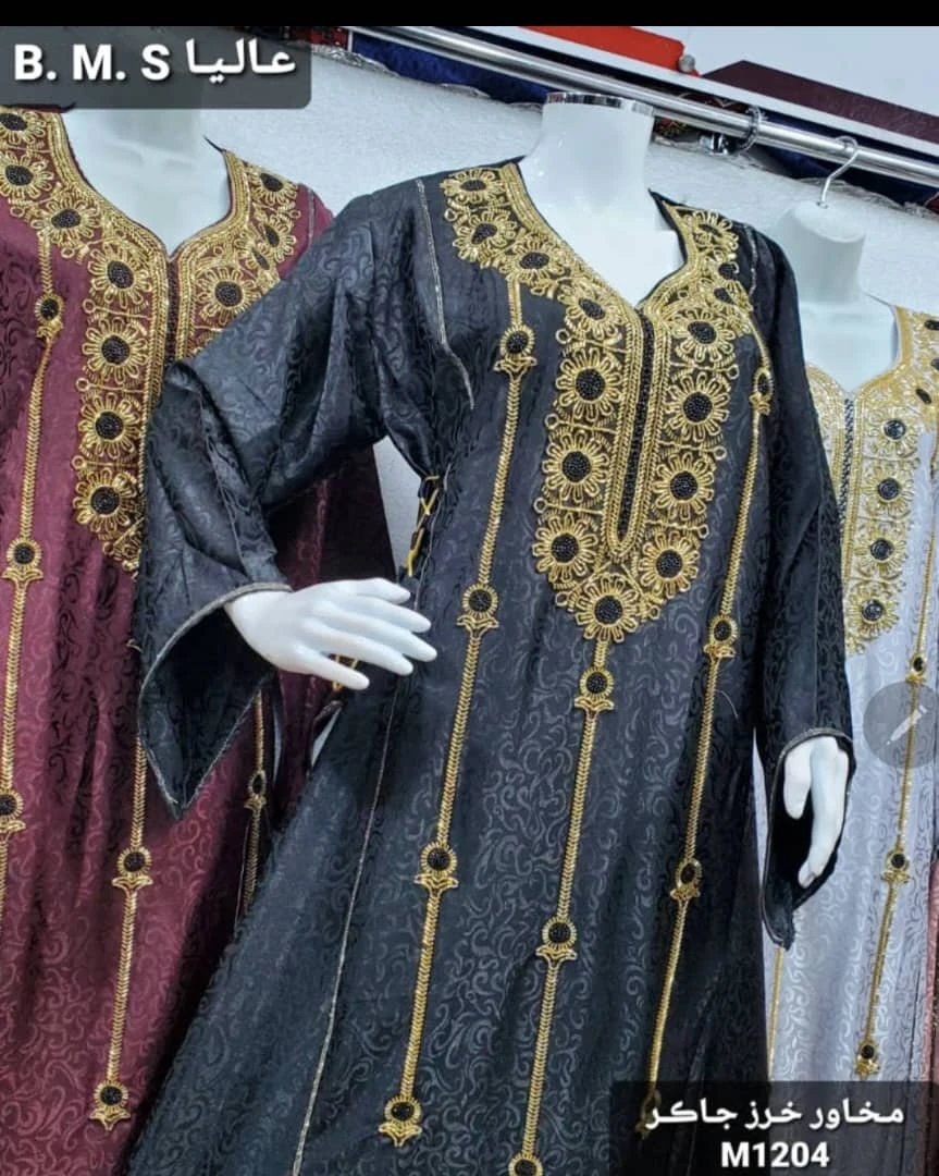 جلابيات ومخاور نسائية بتصميم فاخر من قماش ناعم عالي الجودة مزينة بتطريز ذهبي جذاب يضفي لمسة من الفخامة والرقي. تتميز بقصّة فضفاضة مريحة تناسب جميع المناسبات، مع تفاصيل أنثوية تضفي مظهرًا راقيًا وأنيقًا.